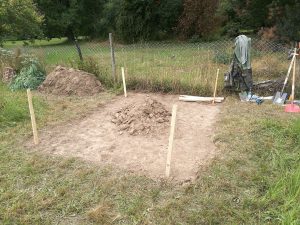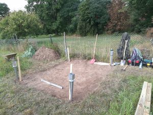 Aber gemeinschaftlich kann man alles schaffen  und so war das Ergebnis dieses Tages nicht nur die Begrenzung unseres Grundstückes sondern auch die vorbereitete Fläche für unseren Schuppen: