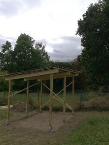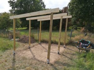 Nach einem ersten großen Einkauf im Baumarkt konnte es endlich losgehen. Zu allererst mussten wir die Stützen der Hütte so mit dem Boden verankern, dass der Schuppen wirklich rechteckig wird.