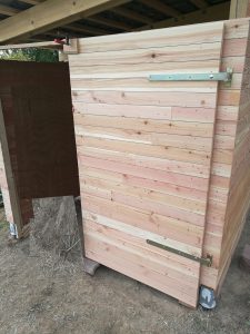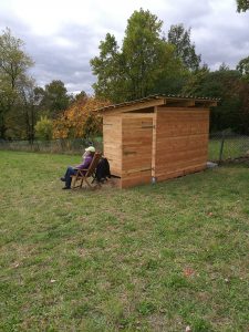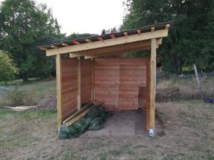 Nun fehlte neben den vielen Kleinigkeiten noch eine Tür. Also auf zum letzten Tag. Leider regnete es diesmal zwischendurch immer wieder, so dass wir doch wieder mal viel länger brauchten als wir am morgen dachten. Aber Abends war es dann endlich soweit. Wir konnten nach einer Pause vor unserem Schuppen erstmalig unsere Werkzeuge und Materialien im Schuppen verschliessen. Und morgen kommt der Rasenmäher in den Schuppen…..