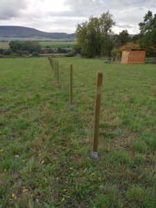 Unserer Wahl fiel dann auf einen Zaun aus Kunststoffgeflecht, wie wir ihn bereits für unser heutiges Hühnergehege verwenden. Das Ganze getragen von Zaunpfosten auf einer Einschlaghülse. Ich gebe dabei zu bedenken, dass unser Grundsück doch eine gewisse Länge hat und wir zwar erst einmal nur eine Seite bezäunen wollen, dieser Zaun dann aber bereits eine Länge von ca. 150m hat.