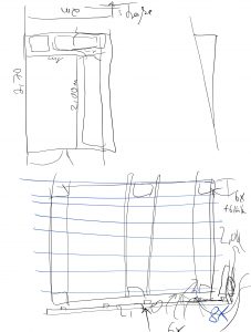 Nach dem Frühstück haben wir zuerst einen groben Entwurf eines Schuppens angefertig. Der Schuppen soll ca 2 x 3 m groß werden und hoch genug sein, dass man aufrecht hinein gehen kann. Später sollen dort dann Gartengeräte ihren Platz finden (Natürlich auch die dann hoffentlich nur noch notwendigen Rasenmäher).